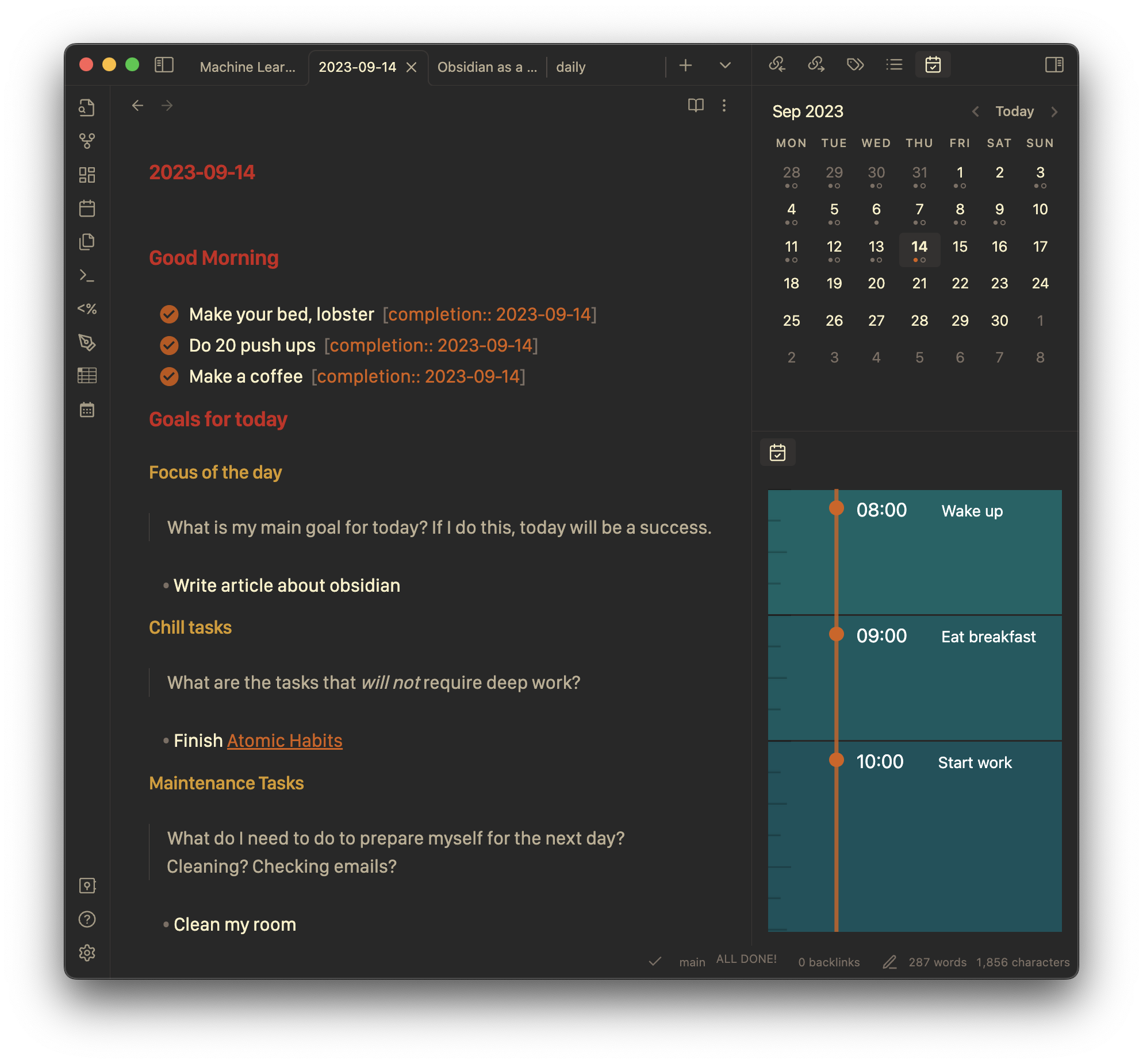 Much of my setup revolves around my daily note, which I use as a sort of homepage that contains my goals, TODOs, and schedule.